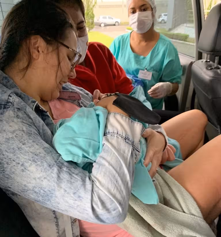 Thiago estava dirigindo e Lizandra estava na parte de trás do veículo com a doula. O tempo entre as contrações foi diminuindo cada vez mais e no meio do caminho a gestante sentiu vontade de fazer força.