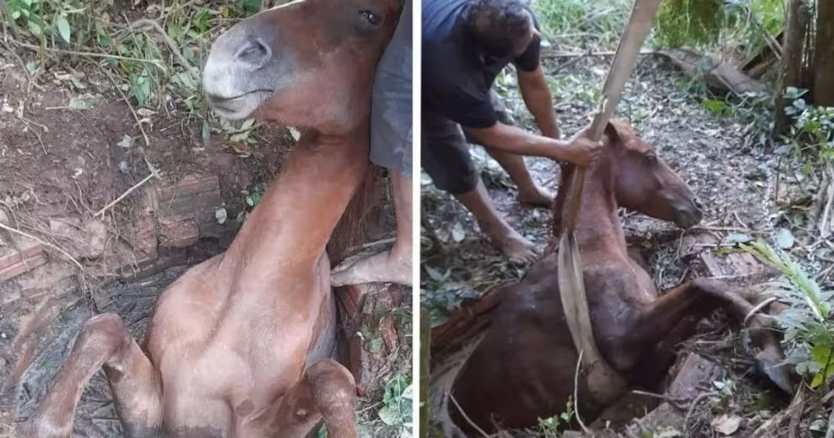 Os bombeiros também contaram com a ajuda dos cuidadores do cavalo para conseguir retirá-lo do poço. Após o resgate, o animal ficou aos cuidados do responsável.