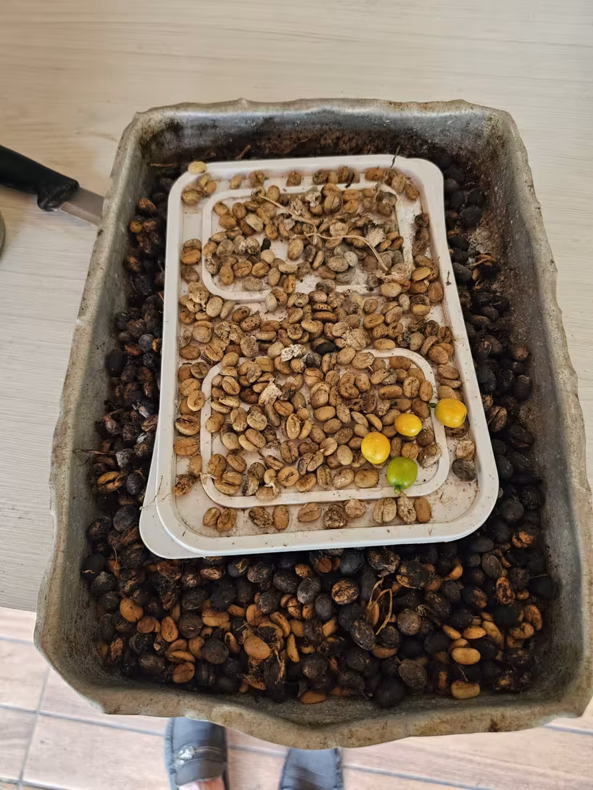 Surpreendentemente, sua paixão pela autossuficiência culmina na plantação e colheita de café, um processo cuidadoso realizado manualmente em sua própria casa.