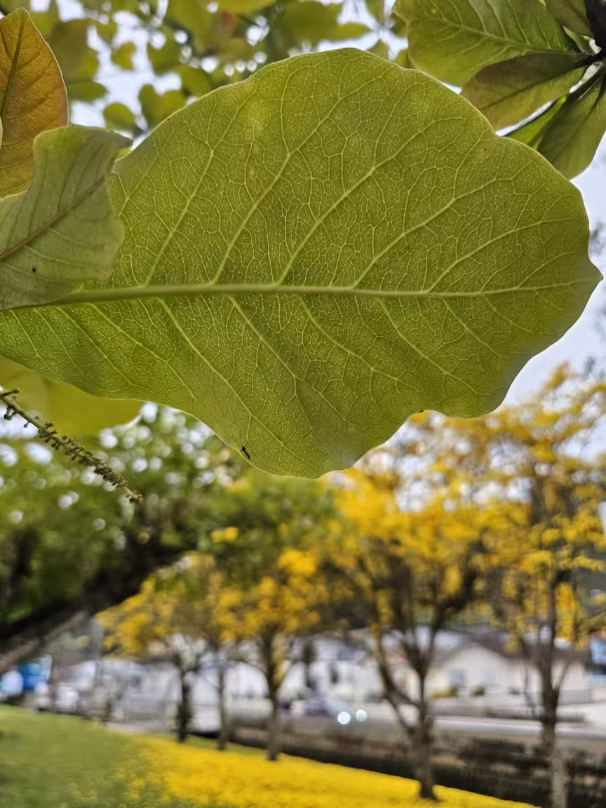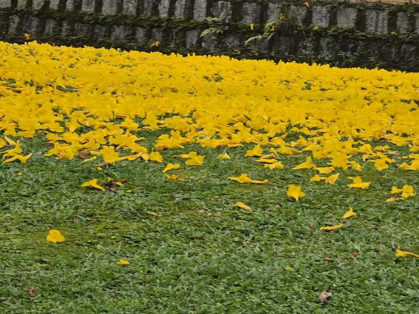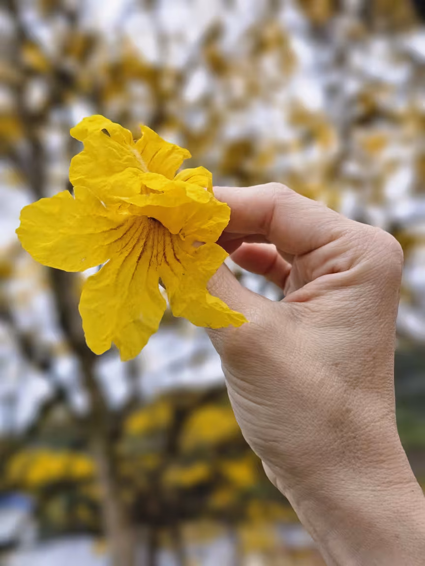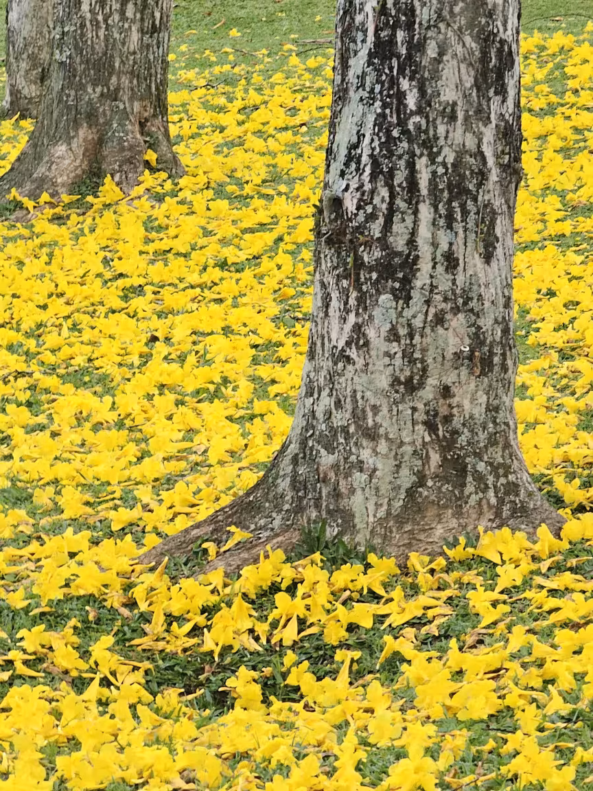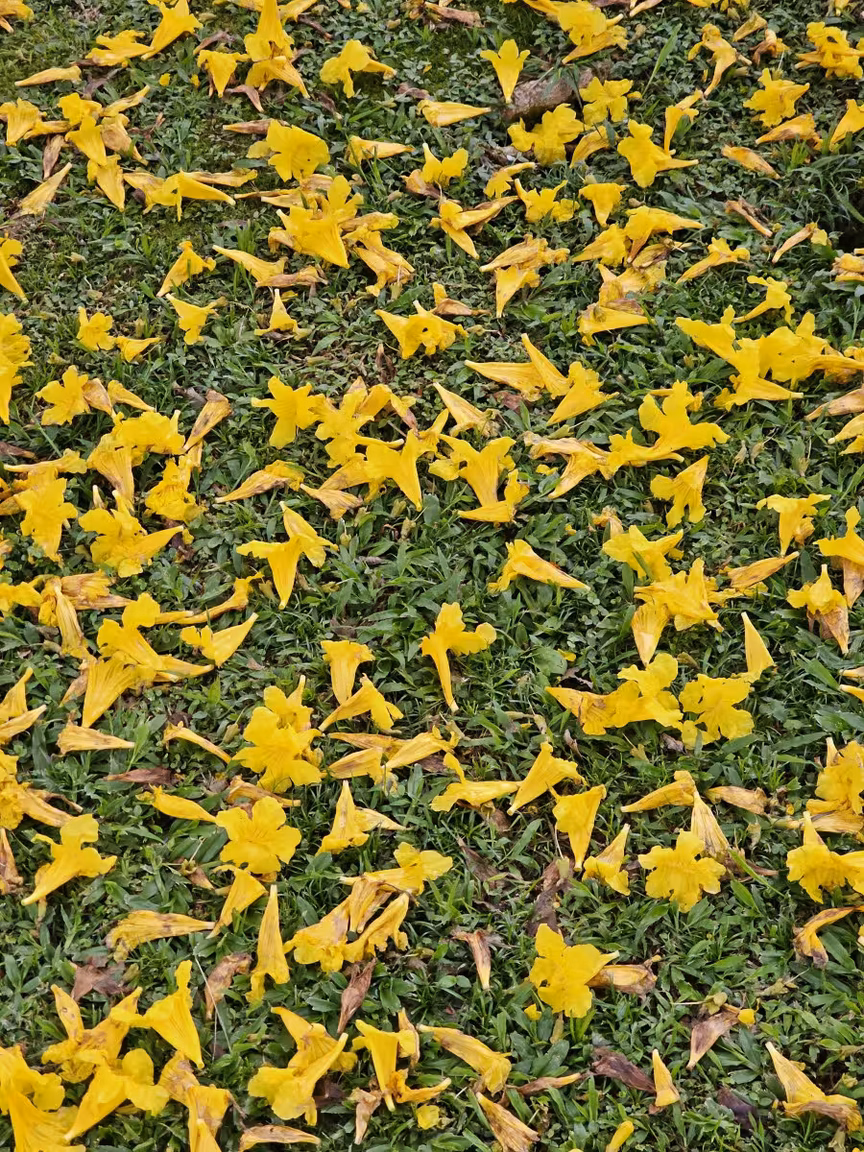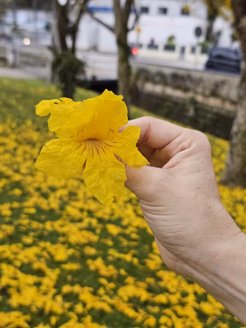 Os ipês-amarelos então hipnotizam os espectadores, encantando a todos que os contemplam. O tapete verde do gramado se harmoniza perfeitamente com o dourado das folhas que caem das copas, criando uma vista deslumbrante de árvores em plena floração.