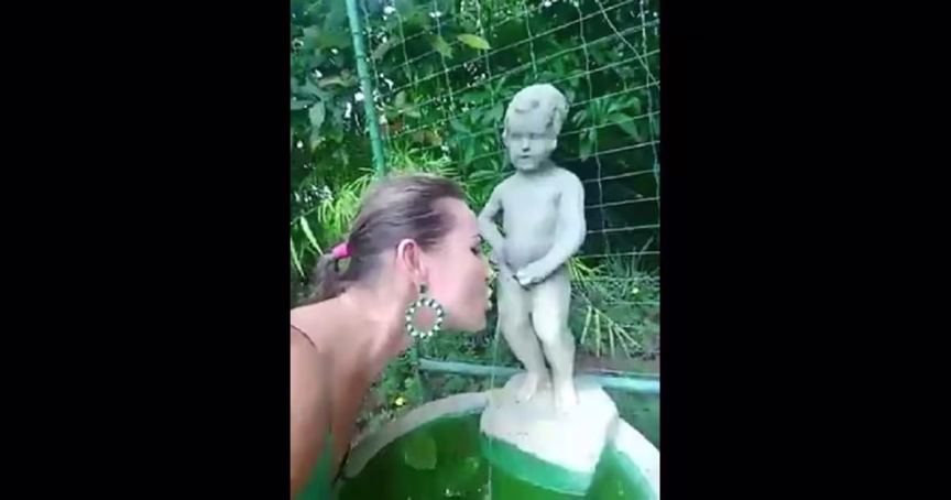 No vídeo, a mulher brinca com a fonte que tem na entrada do parque.