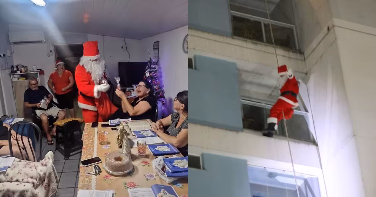 Este é o segundo ano que Samuel se veste de Papai Noel para alegrar as crianças do residencial, porém, desta vez, decidiu inovar descendo de rapel pela primeira vez. A ação novidade foi combinada com o síndico, que ajudou com as chaves do telhado e também com a compra de doces para o Papai Noel distribuir.