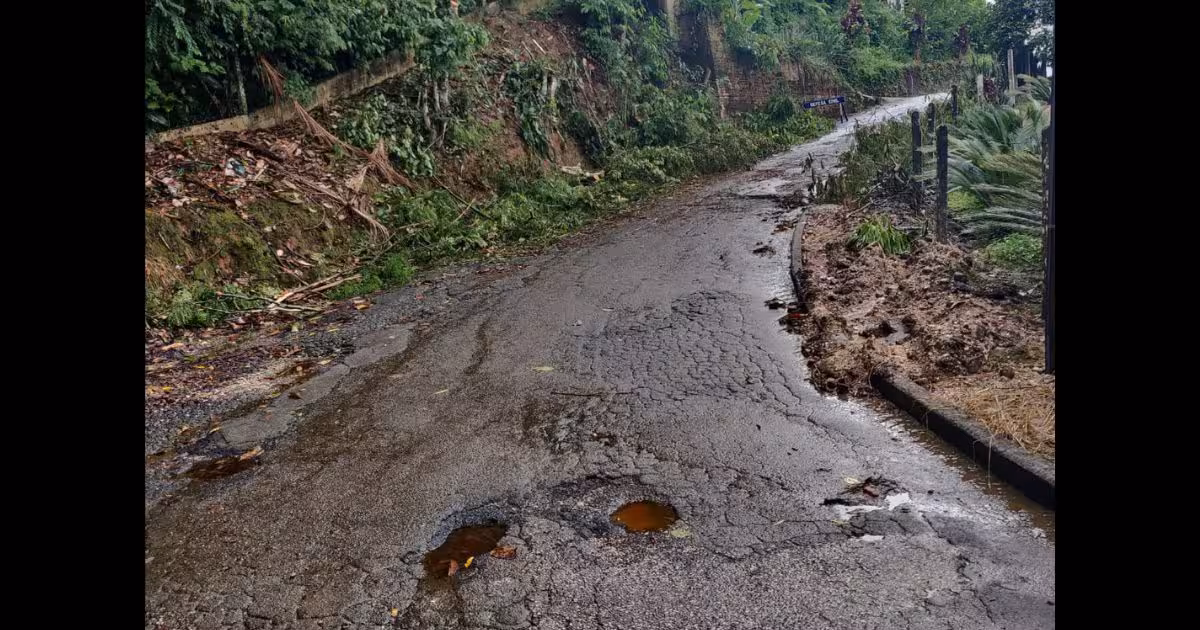 Imagens recebidas pelo jornal O Município mostram o trecho com diversos buracos em uma via inclinada e parte da via ocupada pelas plantas.