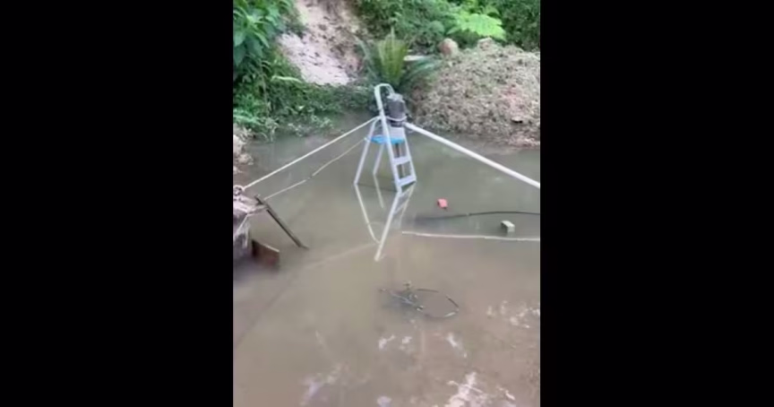 Para drenar a água, ela alugou três bombas d'água e instalou no terreno. Pelas imagens, é possível ver uma das bombas em cima de uma escada.