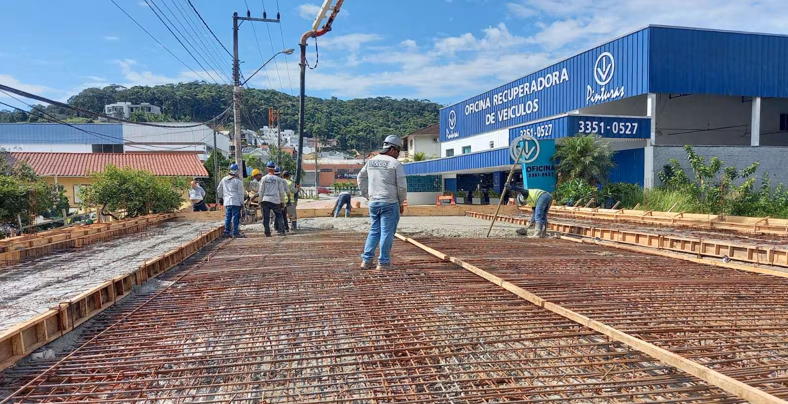 O engenheiro Cristian Fuchs da empresa Paco Pedras, vencedora da licitação, destaca que oito caminhões de concretos, equivalente a 54 m³, foram utilizados na concretagem da laje.