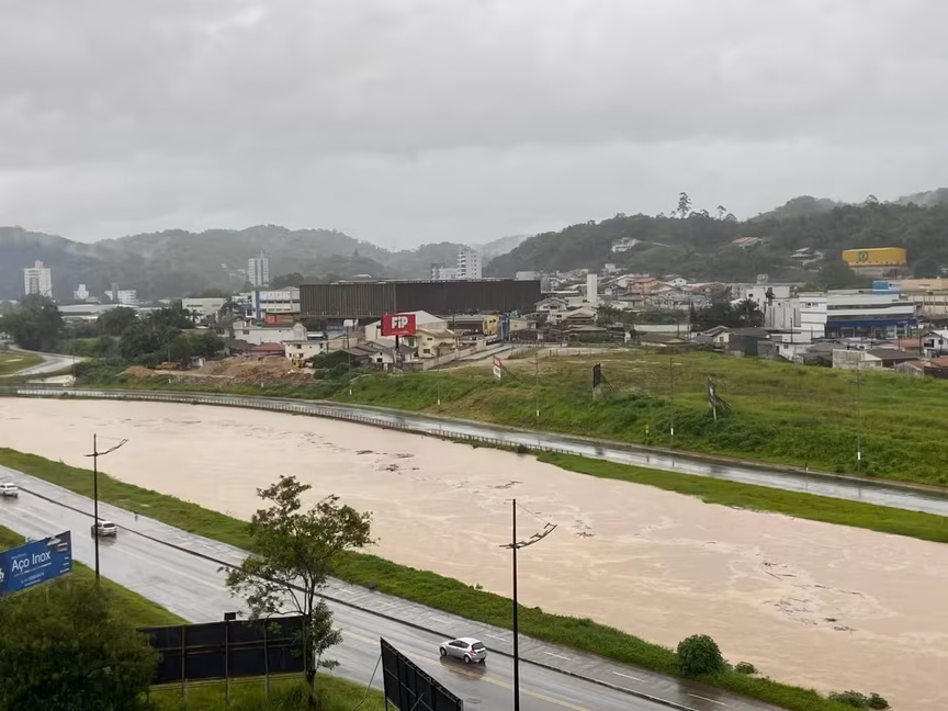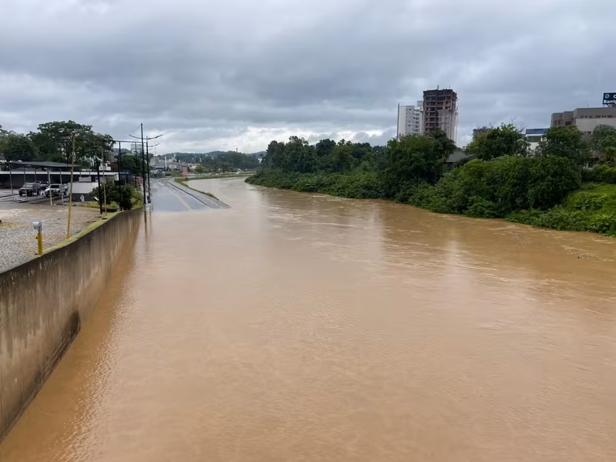 O rio Itajaí-Mirim já apresenta vários pontos que estão saindo da calha, como próximo da ponte Santos Dumont, no bairro Santa Terezinha, perto da Unifebe.