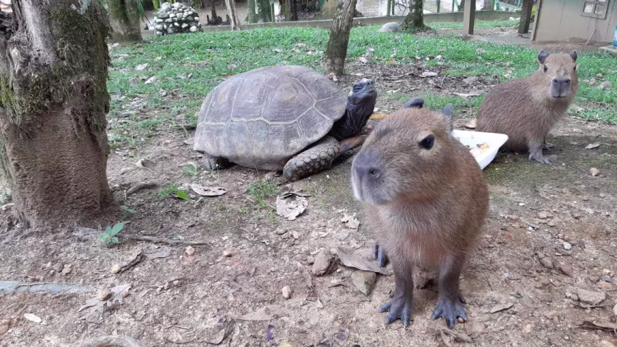A capivara Cacau, que foi resgatada pela Polícia Militar Ambiental após ficar órfã quando sua família foi atacada por cães em Blumenau, cresceu e interage com outros animais do Zoobotânico de Brusque, para onde ela foi levada em dezembro do ano passado.