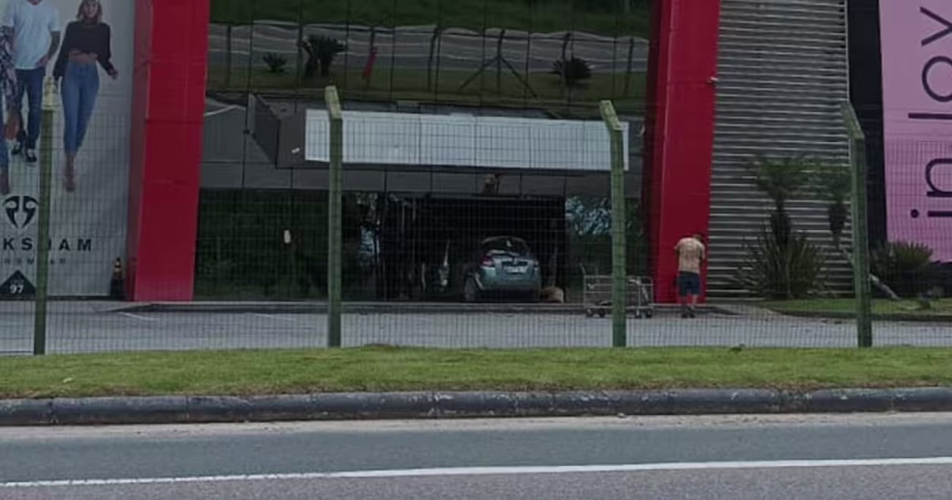 Carro bate em porta de vidro de shopping atacadista de Brusque