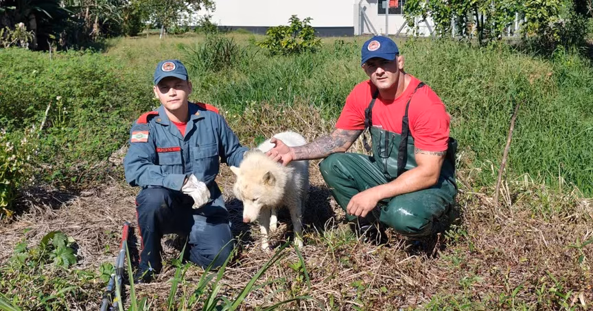 Cachorro que estava desaparecido há dois dias é resgatado às margens de ribeirão no bairro Águas Claras, em Brusque 17/04/2025 • Vitor Souza