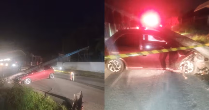 Carro destrói poste após acidente no bairro São Pedro, em Guabiruba