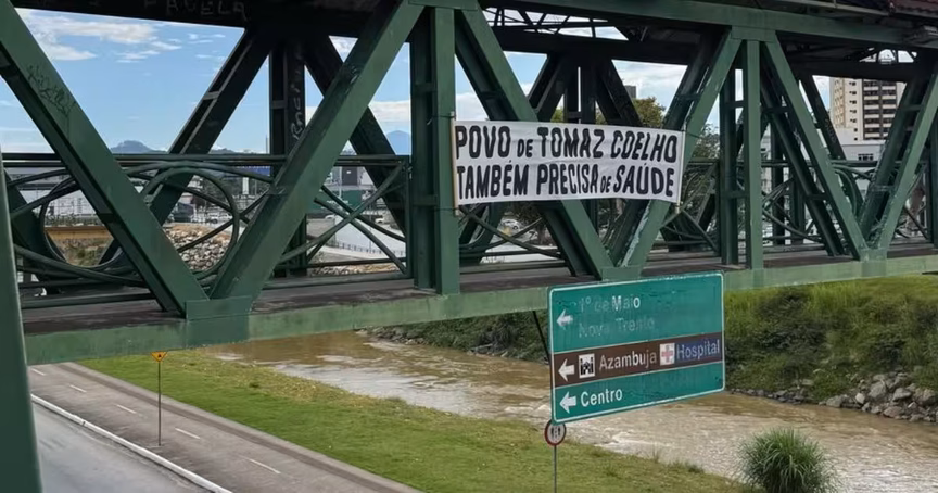 Faixa é colocada na passarela em protesto à construção da nova UBS do Centro, em Brusque