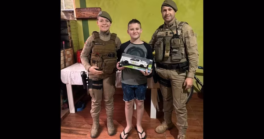 Menino que sonha em ser policial recebe visita de militares durante festa de aniversário em Brusque