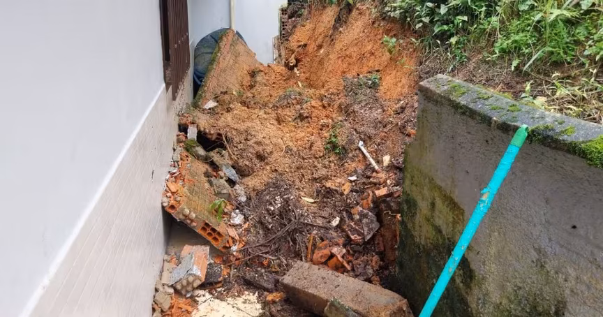 Deslizamento derruba muro de casa no bairro Thomaz Coelho, em Brusque