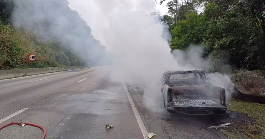 Picape é destruída por incêndio na BR-101, em Balneário Camboriú