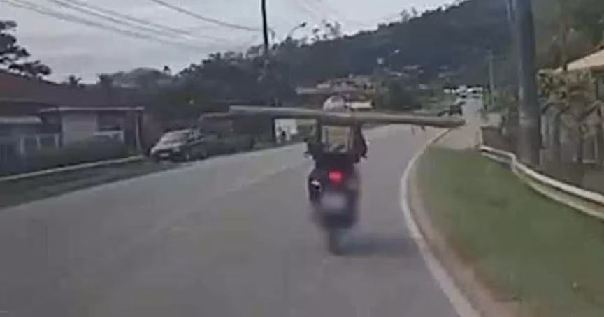 VÍDEO – Motociclista é flagrado transportando tronco de madeira em rodovia de Biguaçu