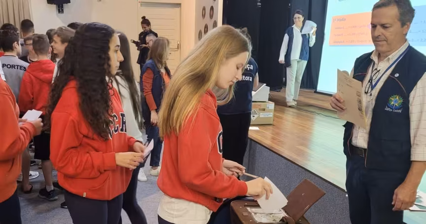 Estudantes do Cônsul simulam votação com cédulas em ato que visa transparência da eleição em Brusque
