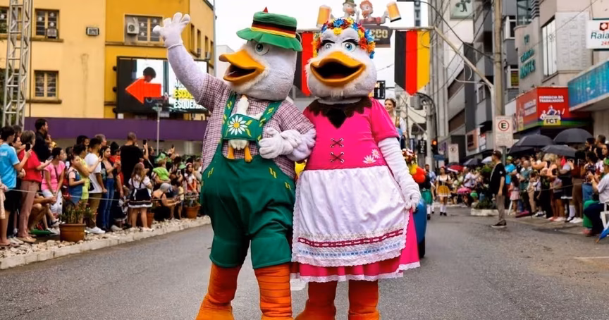 VÍDEO – Moradora de Brusque surpreende ao passear com pato vestido de “fritz” na Fenarreco