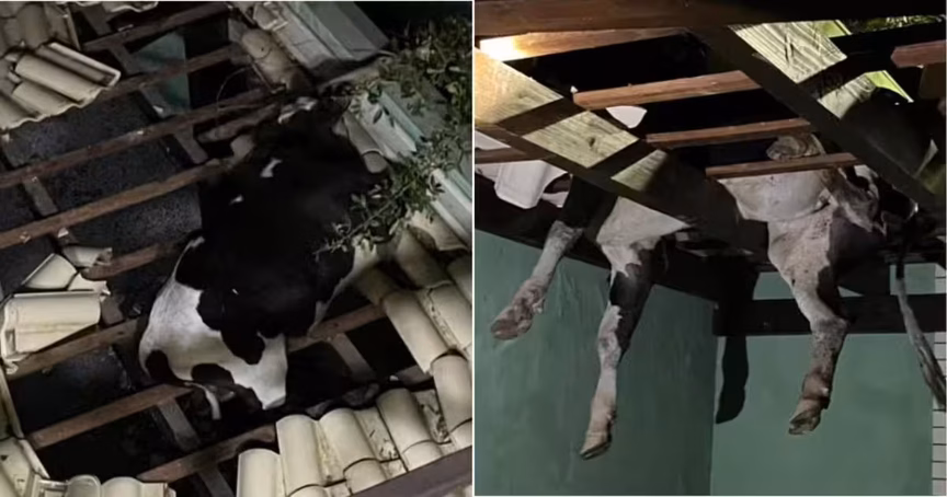 VÍDEO – Boi fica pendurado após cair em cima de telhado em Governador Celso Ramos, na Grande Florianópolis