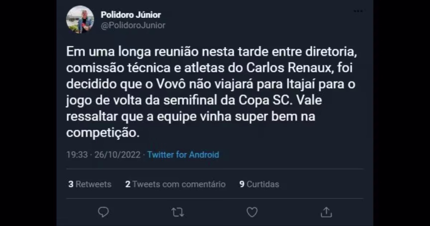 Carlos Renaux desmente postagem que afirma que o time não jogará contra o Marcílio Dias; entenda 27/10/2022 • Redação O Município
