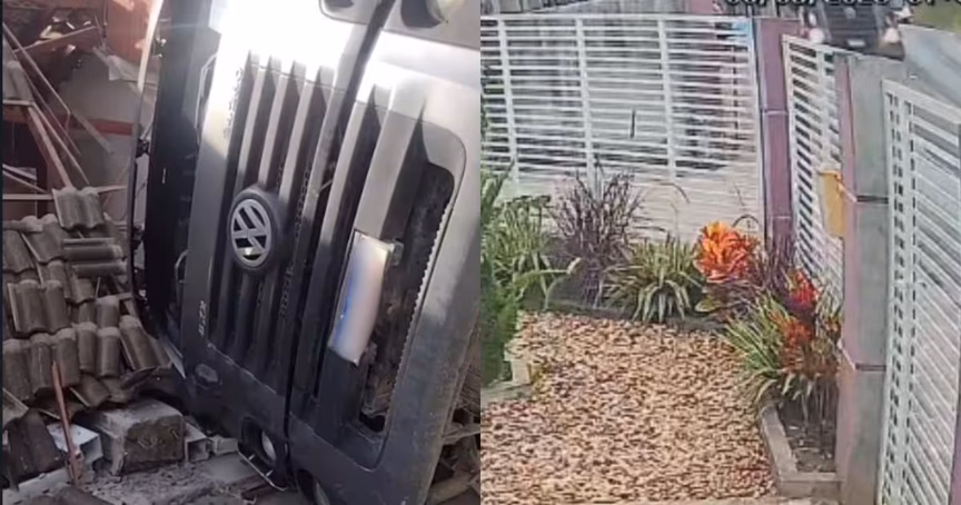 VÍDEO – Inesperado: caminhão carregado de entulho tomba e destrói quintal de casa em Itajaí