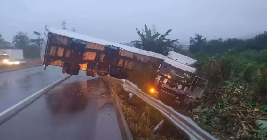 Carreta sai da pista após motorista perder o controle na BR-470, em Gaspar 14/04/2023 • Redação O Município
