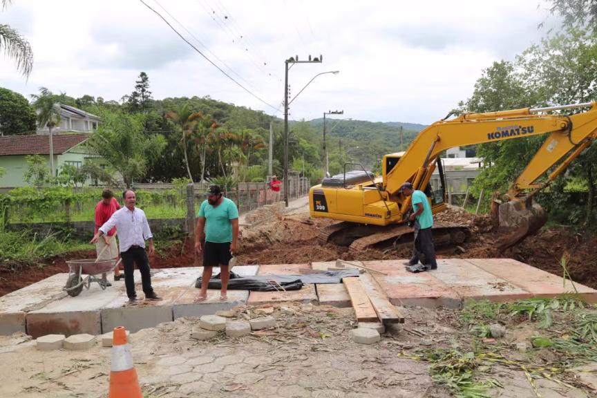 Ponte de madeira é substituída por de galeria na rua Marcos Habitzreuter, em Guabiruba 06/02/2019 • Redação O Município