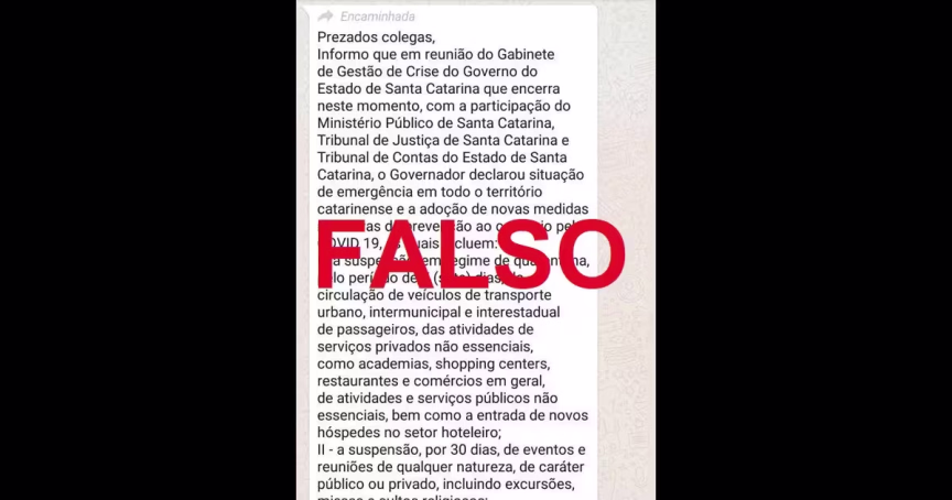 MP-SC esclarece sobre mensagem com medidas de quarentena que circula no WhatsApp