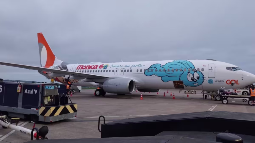 Avião temático da Turma da Mônica chama atenção no aeroporto de Navegantes