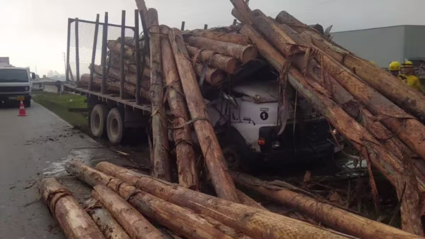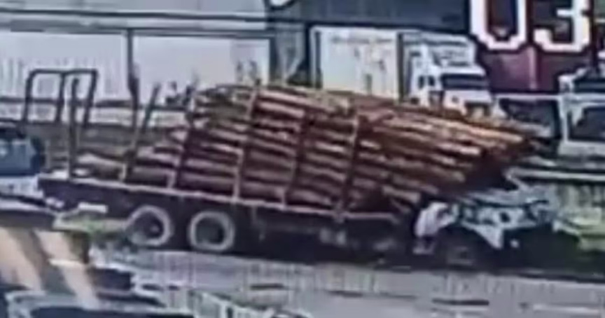 VÍDEO – Câmera registra momento em que carga de madeira se solta de caminhão e mata motorista em Navegantes