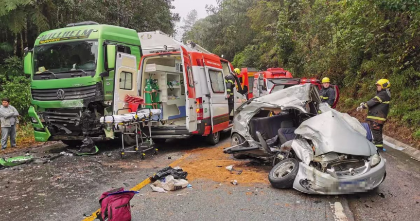 Homem morre e outras três pessoas ficam feridas após grave acidente entre carro e caminhão na BR-282, em Águas Mornas 10/08/2023 • Vitor Souza