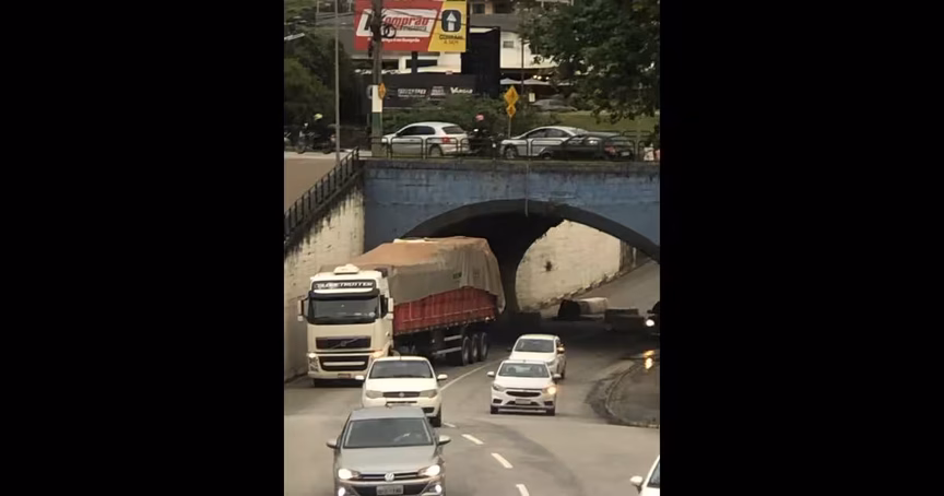 Caminhão derruba carga após passar por baixo de ponte na avenida Beira Rio