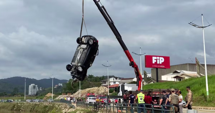 VÍDEO – Carro que caiu no rio Itajaí-Mirim, em Brusque, é retirado