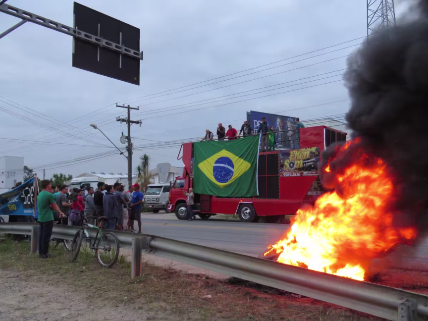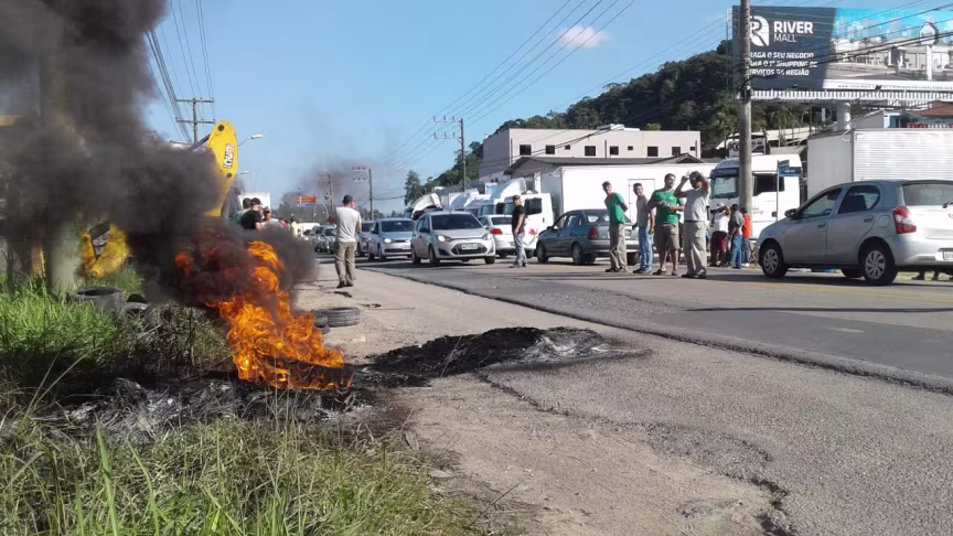 Manifestantes bloqueiam passagem de caminhões em dois pontos da rodovia Ivo Silveira, em Brusque 24/05/2018 • Redação O Município