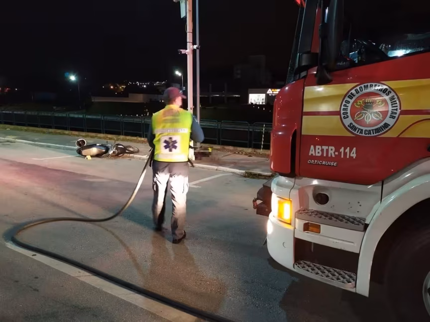 Homem fica ferido após moto pegar fogo em acidente na rodovia Antônio Heil 25/10/2020 • Redação O Município