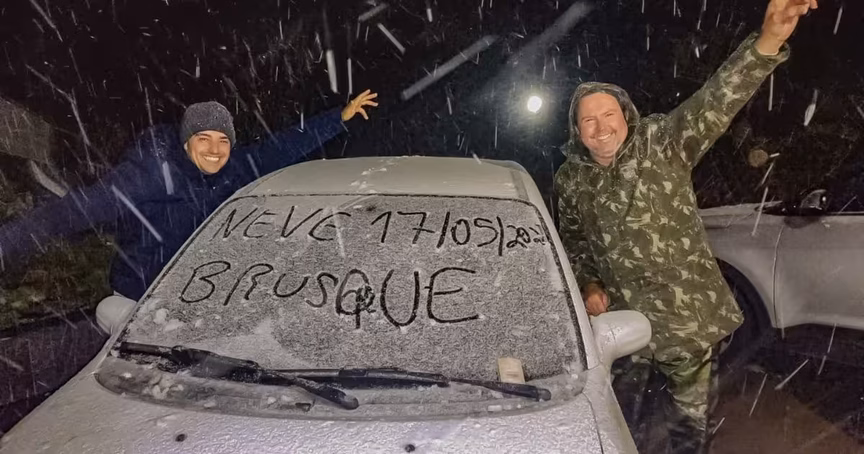 Brusquenses brincam na neve de São Joaquim nesta noite de terça-feira; confira as imagens