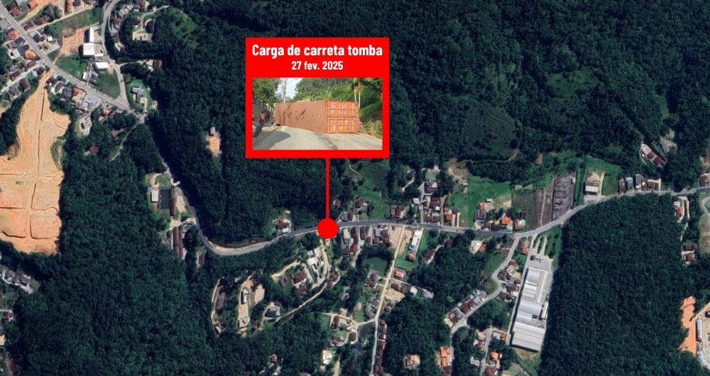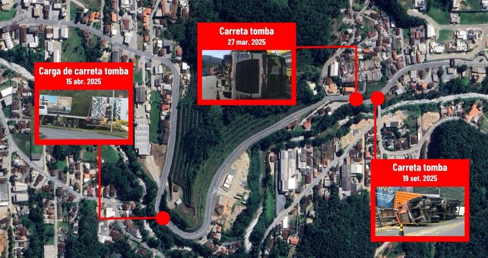 Três tombamentos registrados em 2025 aconteceram na rua dos Imigrantes, o principal acesso entre Brusque e Guabiruba, pelo bairro Guarani. O quarto acidente ocorreu na rua São Pedro.