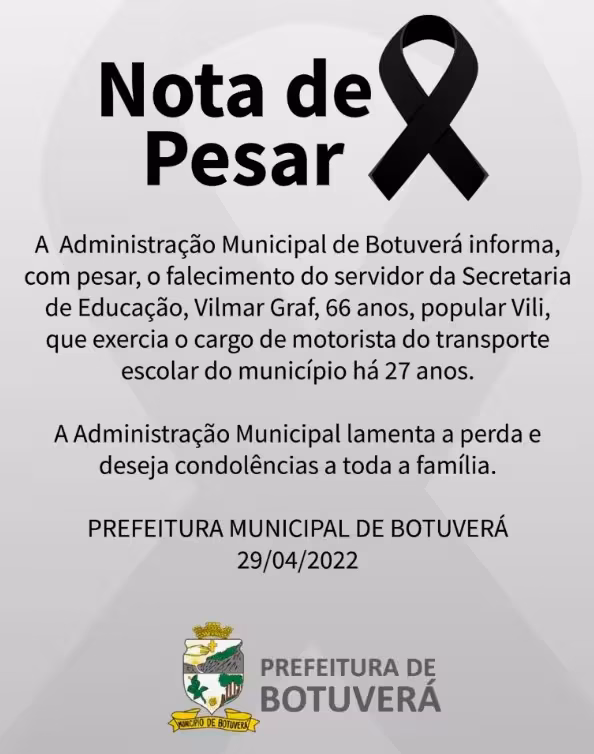 A Prefeitura de Botuverá emitiu uma nota de pesar pelo falecimento do servidor da Secretaria de Educação Vilmar Graf, o Vili, de 66 anos, nesta sexta-feira, 29. Ele trabalhava na empresa desde 1995 como motorista do transporte escolar do município.