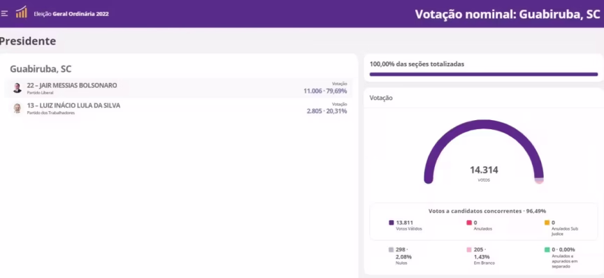 Assim como no primeiro turno, Jair Bolsonaro (PL) foi o candidato a presidente mais votado em Guabiruba neste domingo, 30. O atual presidente fez 11.006 votos na cidade, ou seja, 79,69% dos votos válidos. Já Lula (PT), conquistou 2.805 votos em Guabiruba, o que corresponde a 20,31% dos votos válidos. No primeiro turno, Bolsonaro conquistou 72,87% dos votos válidos em Guabiruba. Lula, por outro lado, recebeu 19,61% dos votos válidos naquela ocasião.