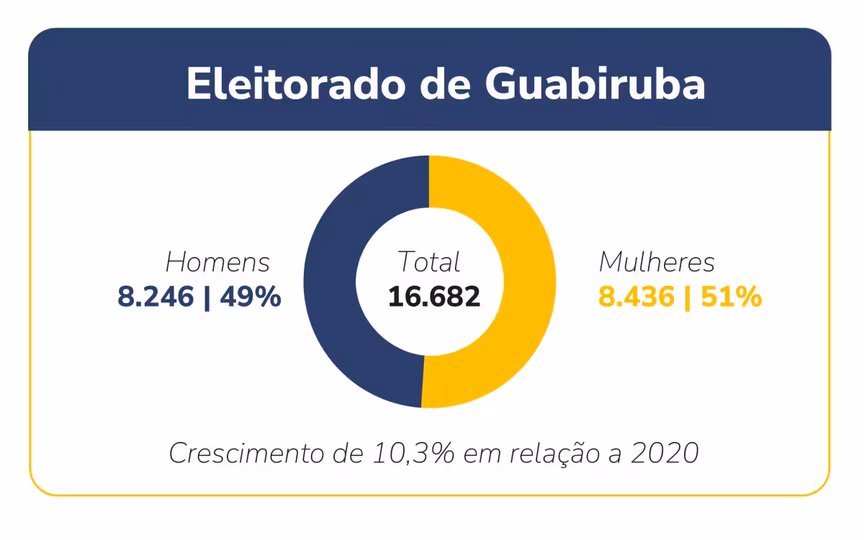 Guabiruba registrou crescimento de 10,3% no eleitorado em relação à última eleição municipal. Estão aptos para votar 16.682 guabirubenses, sendo que 51% são mulheres.