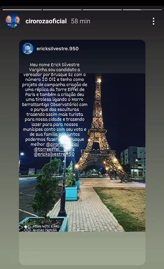 O candidato a vereador Varginha (PSC) propõe criação de réplica da torre Eiffel em Brusque. A publicação foi divulgada no Instagram do candidato a vereador e republicada pelo candidato a prefeito Ciro Roza (Podemos).