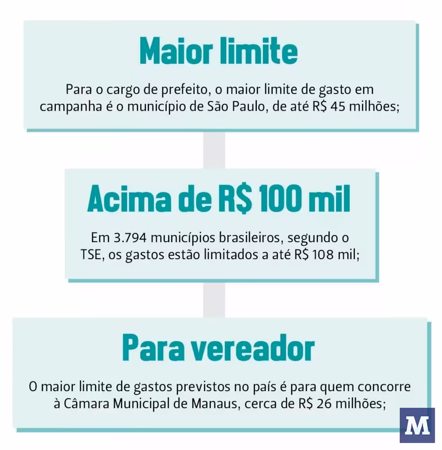 Todos esses números observam a previsão legal de que em nenhum município o teto de gastos pode ser inferior a R$ 100 mil para campanhas à prefeitura; e a R$ 10 mil para quem concorre à Câmara.