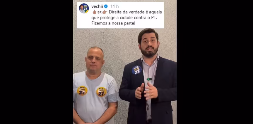 “Por iniciativa nossa, a Justiça Eleitoral entendeu que o PT tem que ficar fora da disputa das eleições aqui na cidade, o PT não terá candidato, a direita de verdade, que combate a esquerda e combate o PT, atua para proteger Brusque”, afirma André Vechi, no vídeo.