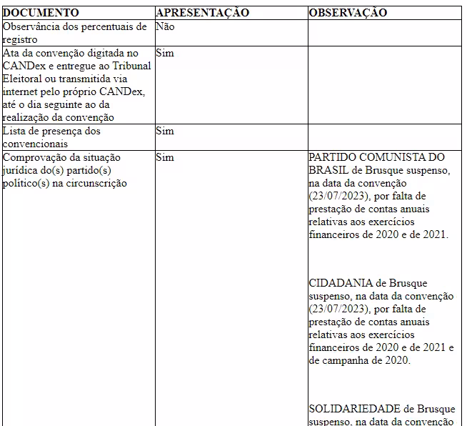 Esse relatório é expedido pelo Cartório Eleitoral, que faz uma verificação minuciosa de todos os pré-requisitos necessários para o registro das candidaturas e das coligações, conforme o exemplo abaixo, em que foram feitas anotações a respeito de irregularidades nos órgãos partidários municipais.