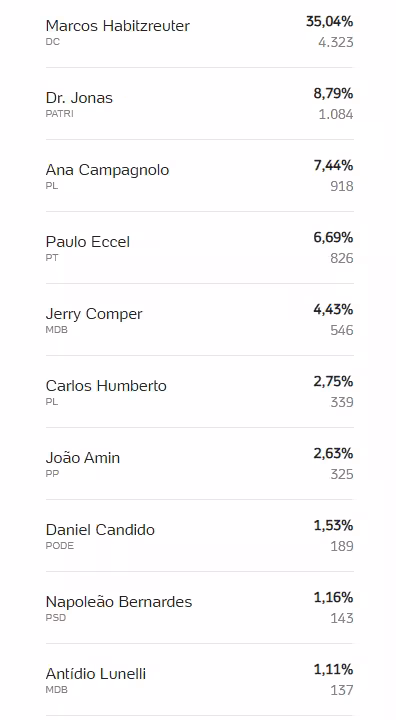 Além dele, Dr Jonas (Patriotas) foi o segundo mais votado, com 1.084 votos. Em seguida, vem Ana Campagnolo (PL), com 918 votos, Paulo Eccel (PT) com 826 votos; Jerry Comper (MDB), com 546; e Carlos Humberto (PL), com 339. Dos citados acima, apenas Ana Campagnolo, Carlos Humberto e Jerry Comper conseguiram se eleger.