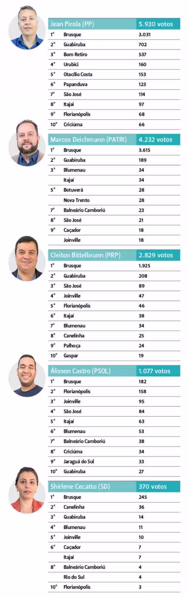 O candidato mais votado da região de Brusque, Serafim Venzon (PSDB), segue em linha semelhante. Dos seus 30.085 votos, 35,44% são de seu domicílio eleitoral. Ele ainda conquistou mais de mil votos em Itajaí, Tijucas e Canelinha.