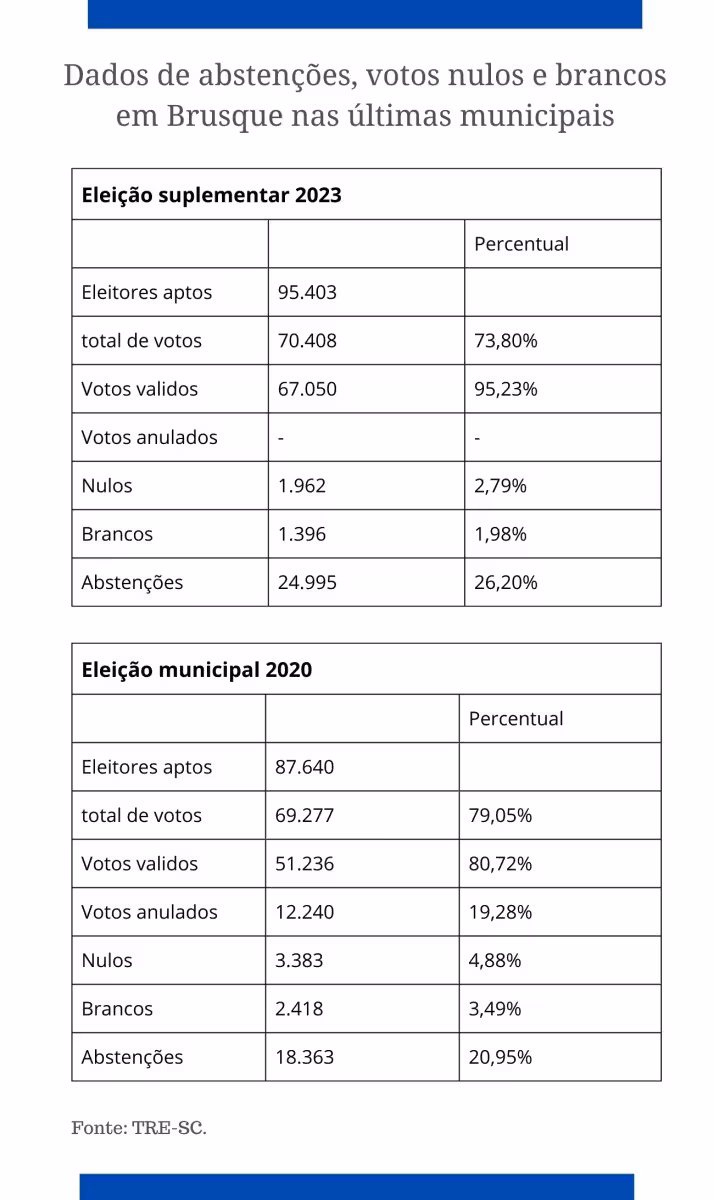 De acordo com a análise dos dados do TRE-SC, nesta eleição 24.995 mil pessoas que estavam aptas para votar não compareceram nas urnas. Isso representa 26,20%. Ao todo, Brusque tem 95.403 pessoas aptas para votarem, mas somente 70.408 mil exerceram a cidadania neste domingo.