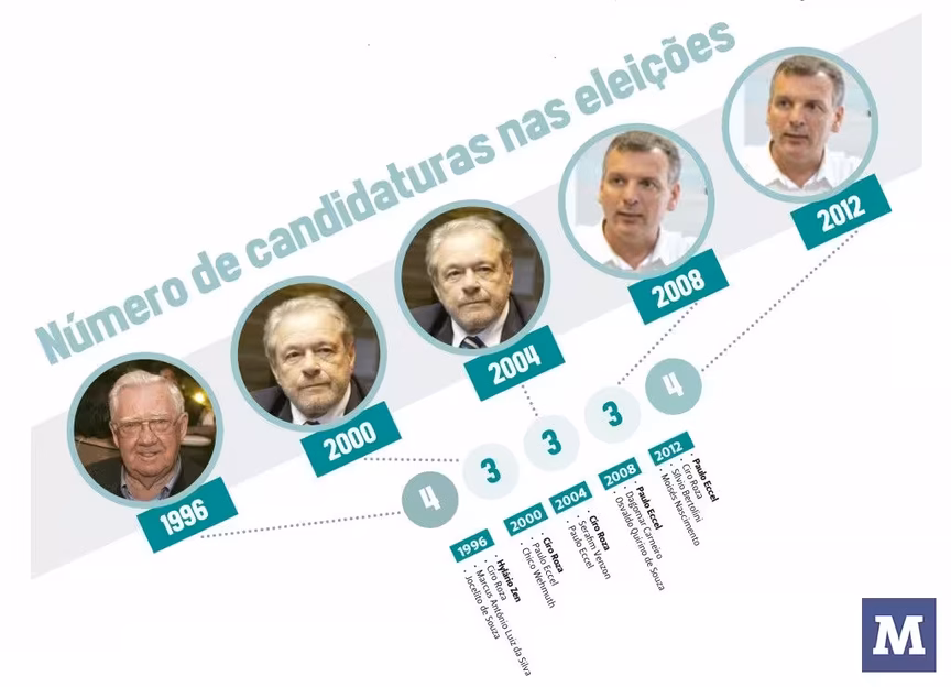As eleições que tiveram mais candidaturas foram em 2012 e 1996, ambas com quatro nomes na disputa. Na média, contudo, costumam ser três os candidatos a brigar pela cadeira de prefeito. Historicamente, dois disputam nas cabeças, e um terceiro faz uma quantidade bem menor de votos.