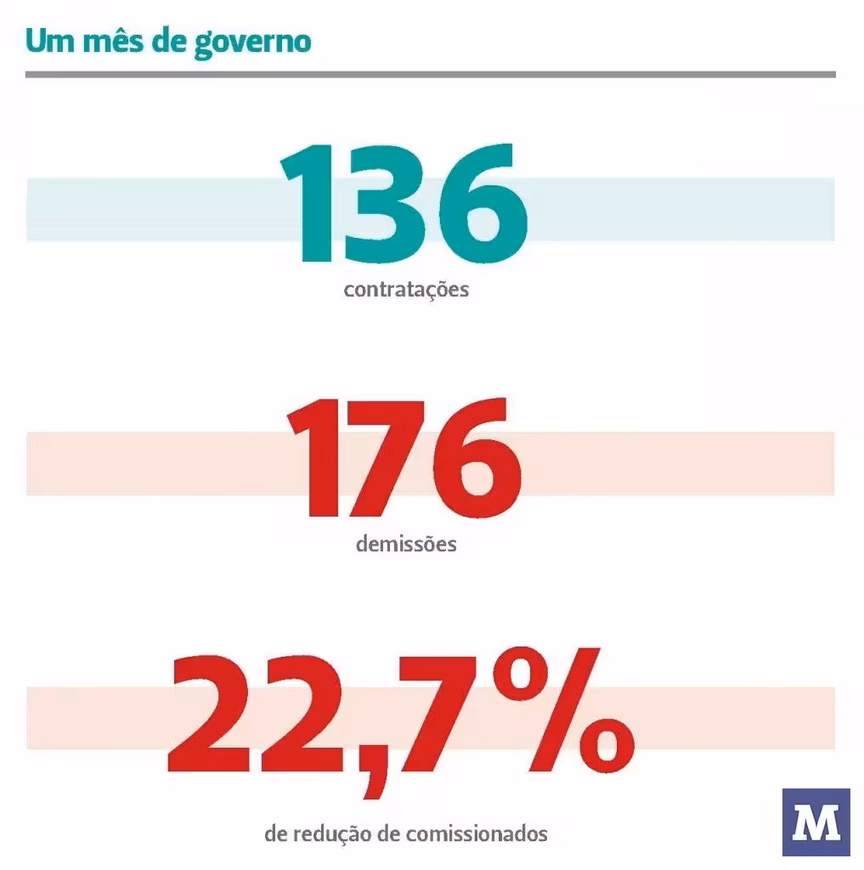 O governo municipal nomeou 136 cargos de confiança desde que tomou posse, em 1º de janeiro, até ontem. O número é menor do que os demitidos, que foram 176 no mesmo período. Na prática, a nova gestão reduziu em 22,7% o número de cargos comissionados.