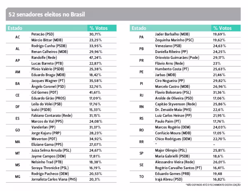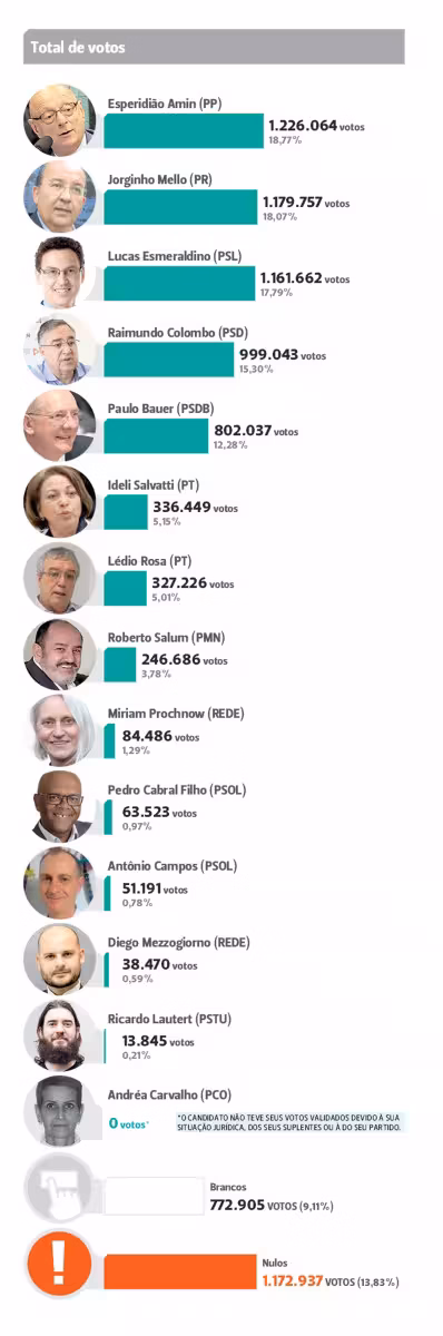 A grande surpresa desta eleição foi Lucas Esmeraldino, do PSL, legenda de Bolsonaro. Vereador por Tubarão, no Sul do estado, ele conseguiu atingir 17,79% da preferência do eleitorado logo na sua primeira disputada para o Senado.