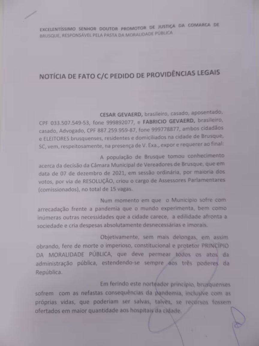 Os ex-vereadores contra o projeto são Cesar Gevaerd e Fabricio Gevaerd. No documento, eles argumentam que o município sofre com a arrecadação devido à pandemia de Covid-19 que atingiu todo o mundo, além de outras necessidades que a cidade carece. “A edilidade afronta a sociedade e cria despesas absolutamente desnecessárias e imorais”.